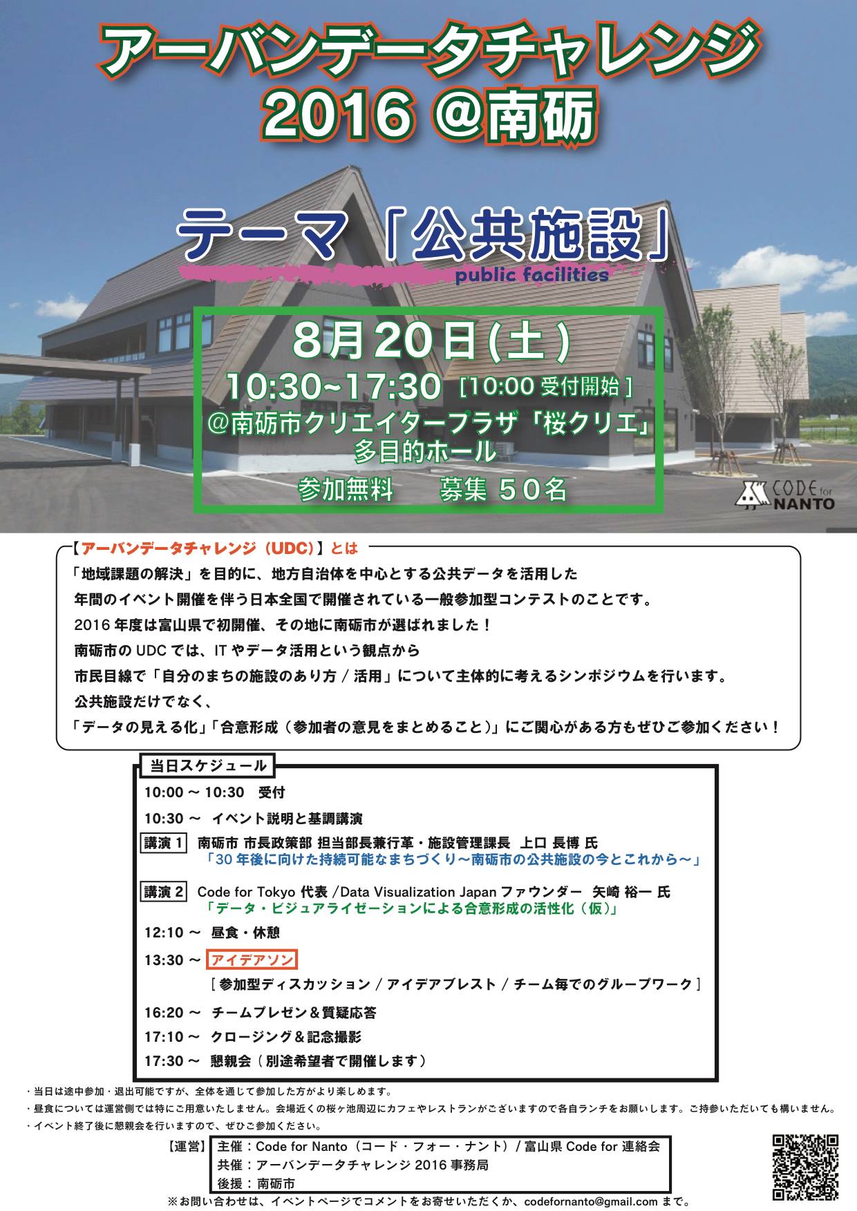 - イベント名: 富山県南砺市・Code For Nanto/「公共データの活用」と「データの見える化」で考える南砺市の公共施設再編(アーバンデータチャレンジ2016@南砺 公共施設アイデアソン)